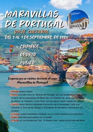 El Área de Cultura del Ayuntamiento de Vícar informa que aún quedan plazas libres para participar en el próximo viaje cultural que tendrá lugar el próximo mes de septiembre y que en esta ocasión tiene como destino algunas de las ciudades más bellas de Portugal. El viaje está previsto para los días del 2 al 7 de septiembre, en una interesante propuesta para conocer varias ciudades del país vecino así como de Extremadura y Andalucía