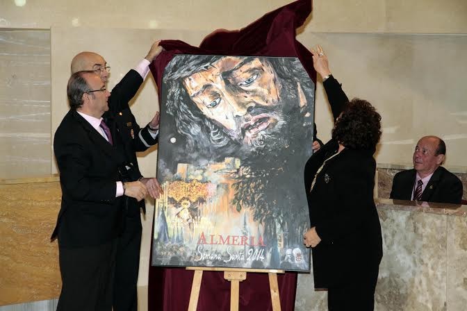 El salón de plenos del Ayuntamiento de Almería se ha llenado para asistir a la presentación del cartel de la Semana Santa 2014. Un acto que llegaba con una novedad y es que por primera vez la imagen del cartel corresponde a un pintura y no a una fotografía. La imagen escogida ha sido la ganadora del primer concurso de pintura que organizaba la Agrupación de Hermandades y Cofradías de Almería. Y es que este año en vez de las cámaras han mandado los pinceles y los colores en el diseño del cartel.