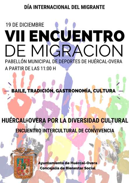 El Ayuntamiento de Huércal-Overa celebra el VII Encuentro de Migración Intercultural, con motivo del Día Internacional del Migrante, el próximo domingo 19 de diciembre con un acto que se llevará a cabo en el Pabellón Municipal de Deportes, desde las 11:00 horas, volviendo a apostar por este evento tras la buena acogida que ha tenido en las pasadas ediciones siendo ya un referente en la convivencia de los vecinos del municipio.