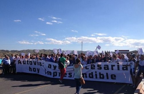 Alrededor de unas 300 personas entre empresarios, asociaciones, políticos y ciudadanos se han manifestado en la tarde de este jueves, 23 de mayo, para exigir al Gobierno andaluz que se reanuden y finalicen las obras de la Autovía del Almanzora que actualmente se encuentran paralizadas pese a que el Ejecutivo andaluz ha manifestado su intención de retomar actuaciones sobre parte de estas infraestructuras cuya partida económica está recogida en el Presupuesto General de la Junta para 2013.