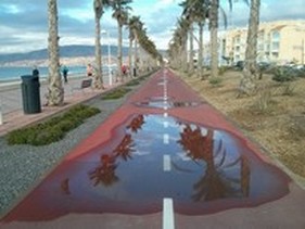 Dichas medidas se establecen en el acuerdo marco firmado entre ambas instituciones en marzo de 2014, y entre ellas figuran criterios técnicos que “poco o nada tienen que ver con lo acordado”. Por ejemplo, la portavoz de UPyD-Almería, Laura Rodríguez-Carretero, señala el punto en el que se hace referencia a la tipología del trazado. “El acuerdo dice literalmente que los carriles bici dispondrán de protección frente a condiciones meteorológicas adversas con la correcta elección del pavimento, pero el otro día cayeron cuatro gotas y el nuevo carril bici del paseo marítimo quedó inutilizable” (adjuntamos fotografía).