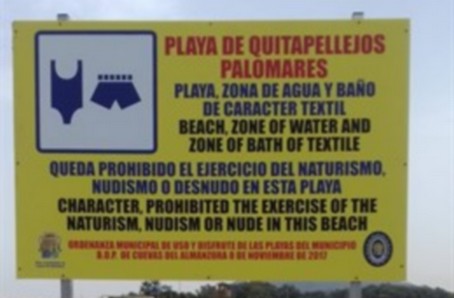 Vecinos de la asociación Veraplayazul de Vera (Almería) han presentado una queja ante el Ayuntamiento de Cuevas del Almanzora ante el cartel colocado en el límite entre las playas colindantes de Palomares y Cala del Marqués de Vera con el que se prohíbe el baño a las personas que practican el naturismo –tradicionalmente ejercido en Vera– cuando “durante los últimos 35 años ha reinado en esa franja el respeto y la tolerancia entre textiles y nudistas”.