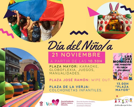 En este sentido, para el próximo domingo día 21 de noviembre, la concejalía de Educación del ayuntamiento de Vera ha organizado a partir de las 10:30 horas una variada programación de actividades en diferentes puntos del casco urbano. Así, la Plaza Mayor será el escenario de juegos y manualidades, actividades de globoflexia y concursos de Karaoke; en la Plaza de José Ramón “El Alicantino” se instalará un castillo de actividades “Wipe Out”; y en la Plaza de la Verja se instalarán colchonetas infantiles.