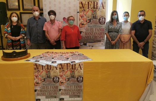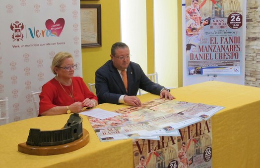 La concejal de Festejos, Amparo García y Ginés Carmona, en representación del Hotel Restaurante Terraza Carmona donde ha tenido lugar la presentación, han dado a conocer esta mañana los detalles del festejo taurino que se celebrará el próximo domingo 26 de septiembre en Vera dentro de sus fiestas patronales en honor a San Cleofás.