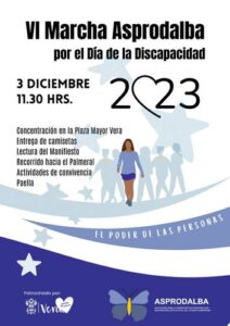 Por otro lado, el domingo 3 de diciembre, coincidiendo con el Día Internacional de la Discapacidad, tendrá lugar la cuarta edición de la Marcha Asprodalba bajo el lema “El poder de las personas”, con una concentración en la Plaza Mayor de Vera a partir de las 11,30 horas donde se hará lectura de un manifiesto antes de iniciar el recorrido por las principales calles el municipio hasta llegar al recinto ferial de “El Palmeral”, donde los participantes podrán disfrutar de diferentes actividades de convivencia y degustar una gran paella gigante.