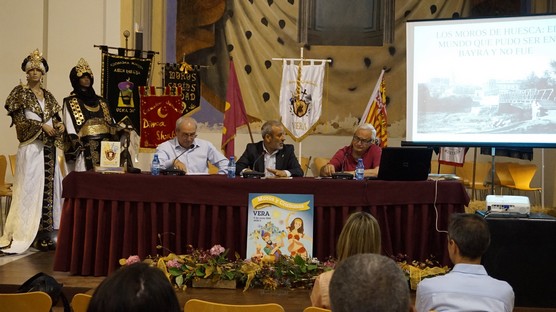 Tras la presentación del conferenciante a cargo de Pedro López, secretario de la Asociación Cultural Moros y Cristianos de Vera, el historiador Ánchel Conte efectuó un breve recorrido histórico desde que a finales del siglo XI, la ciudad musulmana de Waska es conquistada por Aragón y se convierte en su capital. Incapaz de repoblar todas las tierras conquistadas, Pedro I, en las capitulaciones con las poblaciones conquistadas, permite que los musulmanes permanezcan en ellas conservando su religión y leyes, y así permanecen hasta el momento del bautismo obligado por Carlos I en el siglo XVI. En el caso de Huesca, la comunidad musulmana está bajo el poder del rey, que la defiende de los ataques de la Iglesia y el Concejo ya que en ellas tenía una buena fuente de ingresos especialmente procedentes de las actividades comerciales y artesanas de los mudéjares. La convivencia con los conciudadanos cristianos fue normalmente pacífica, salvo momentos de exacerbación religiosa provocada por el obispo, los dominicos y por Vicente Ferrer, mientras que fue mucho más conflictiva con los judíos. Más de cuatrocientos años de vida en común con la mayoría cristiana no les apartó de su fe, pero si se llevó a cabo un lento proceso de aculturación que hizo que el árabe fuera solo lengua litúrgica y que en su aspecto externo no se diferenciaran de los cristianos; estamos ante unos aragoneses no cristianos, pero con conciencia nacional. Tras el bautismo forzado y hasta la expulsión en 1610, ocuparon el mismo espacio y trabajaron en los mismos talleres, pero perdieron su independencia administrativa y se vieron obligados a ser, o al menos aparentar, ser cristianos.