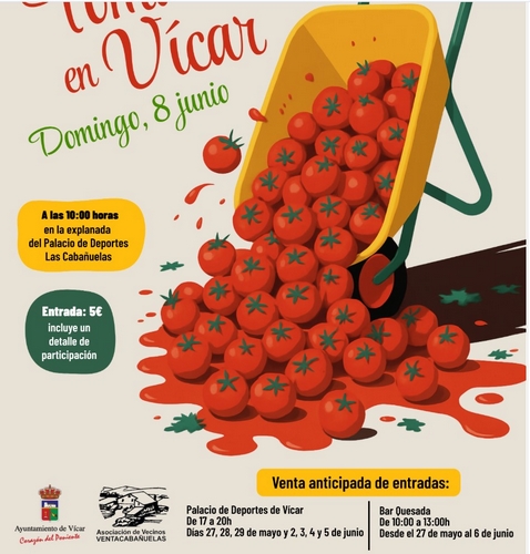 El Ayuntamiento de Vícar y la Asociación de Vecinos Ventacabañuelas darán la bienvenida al mes de junio por todo lo alto con una novedosa y entretenida actividad. Se trata de la tomatada, que tendrá lugar el próximo domingo 8 de junio en la explanada junto al Palacio de Deportes de Las Cabañuelas.
