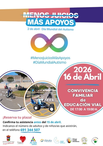 En el marco del Día Mundial de Concienciación sobre el Autismo (2 de abril), el Ayuntamiento de Vícar organiza una jornada de convivencia que tendrá lugar el próximo jueves día 16. La propuesta consiste en una tarde donde, bajo el lema ‘Menos juicios, más apoyos’ las familias participen de un espacio inclusivo para el aprendizaje y el disfrute fomentando el respeto, la empatía y la seguridad vial.