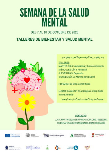 Con motivo del Día Mundial de la Salud Mental (10 de octubre) el Área de Servicios Sociales del Ayuntamiento de Vícar ha organizado toda una semana de actividades en conmemoración de tal fecha. Concretamente, entre el martes 7 y el viernes 10 se van a estar desarrollando diferentes talleres “con el objetivo de dar visibilidad y concienciar sobre algunas de las afecciones más comunes”, ha señalado el Alcalde Antonio Bonilla.