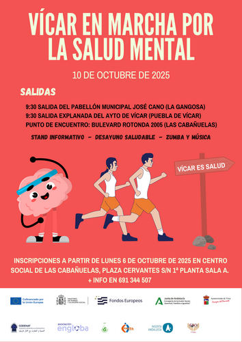 Como actividad final a esta semana de concienciación, el viernes día 10 Vícar se pone ‘en marcha por la Salud Mental’ con una caminata y jornada de convivencia a la que está llamada a participar el conjunto de la sociedad municipal. A las 09.30h los grupos saldrán desde el Pabellón José Cano en La Gangosa y desde la explanada frente al ayuntamiento en Puebla de Vícar, con punto de encuentro en el Bulevar Ciudad de Vícar junto a la rotonda del 2005. Una vez allí, los asistentes compartirán un desayuno saludable y una clase de zumba.