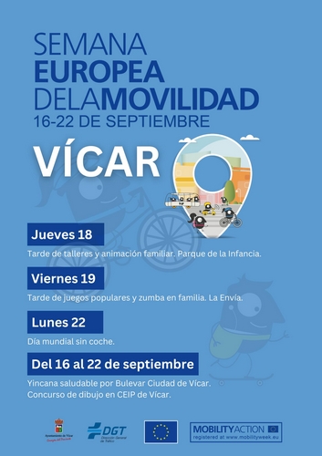 Así, del 16 al 22 de septiembre se llevarán a cabo distintas actuaciones en defensa del mensaje promovido por la Unión Europea, el Ministerio para la Transición Ecológica y el Reto Demográfico y la DGT (Dirección General de Tráfico), a los que se suma el Ayuntamiento de Vícar. Durante toda la semana estará activa la Gymkhana saludable por el Bulevar Ciudad de Vícar y el concurso de dibujo en los centros escolares del municipio. La Gymkhana saludable consta de 10 pistas distribuidas a lo largo del Bulevar Ciudad de Vícar (3km aproximadamente) que podrán completarse en uno o varios días. Cada una de las pistas formulará una pregunta a los participantes, que deberán enviar sus respuestas por WhatsApp (652813875) y entrar así en el sorteo de numerosos premios.
