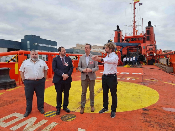 El subdelegado del Gobierno en Almería, José María Martín, ha visitado hoy junto al capitán marítimo, José Aranda Vasserot, el buque remolcador “Punta Mayor”, operado por la Sociedad de Salvamento y Seguridad Marítima (SASEMAR) (Salvamento Marítimo), una entidad adscrita al Ministerio de Transportes y Movilidad Sostenible.