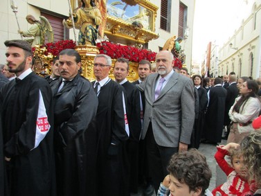 El futuro senador de Vox por Almería, Miguel Ángel Barrionuevo Vílchez, ha asistido hoy a una de las emblemáticas procesiones de la Semana Santa de la Capital, el Entierro, y ha mostrado su devoción en una de las primeras paradas que ha tenido la comitiva justo antes de su llegada a la Catedral procedente de su punto de origen, la iglesia de San Pedro.